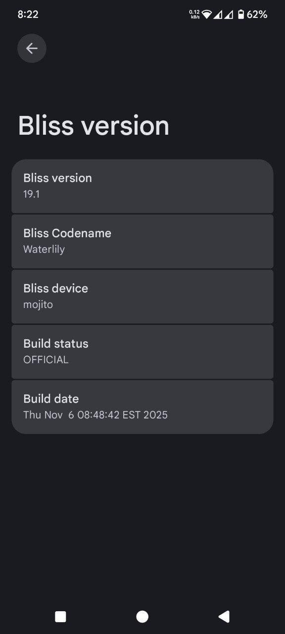 ▪️Changelog: Device (https://raw.githubusercontent.com/Blissroms-Devices/official-devices/main/changelogs/mojito.txt) । ROM (https://blog.blissroms.org/blog/2025/2025-10-12-Bliss-Waterlily-v19.1-Changelog/)